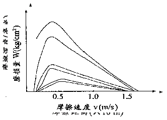 曲線所表示的在初期磨損量大,這是由于磨損面不平滑,實(shí)際接觸面積小,比壓大所造成的。對于平板來說,使用中平板刮研接觸斑點(diǎn)始終處于初期磨損階段,這是造成刮研接觸斑點(diǎn)磨損主要原因之一。根據(jù)磨擦速度、接觸壓力磨損曲線(下圖)可以看出,磨損速度v=0.3~0.5m/s的狀態(tài)下,磨損量最大,這一段稱為粘著磨損。平板的使用狀態(tài)下,工件在平板上移動(dòng)速度也正是在這一階段上進(jìn)行工作的,這是造成刮研接觸斑點(diǎn)磨損的原因之二。